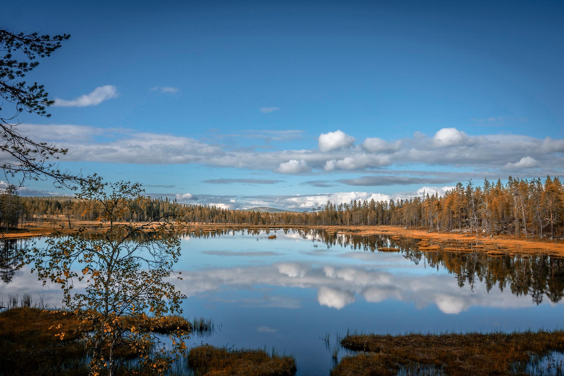 Finnland im Herbst, finnisch Lappland, eine tolle Jahreszeit, goldene Wäldern, frischer Luft und leuchtenden Himmeln. Die herbstliche Laubverfärbung – beginnt im Spätsommer in Lappland und färbt das Land allmählich in warme Töne aus Rot, Orange und Gelb. Wanderungen in den Nationalparks am Nordpolarkreis, ausgehend von Kussamo. Beobachtungen von dreilebenden Braunbären, die Begegnung mit Rentieren.